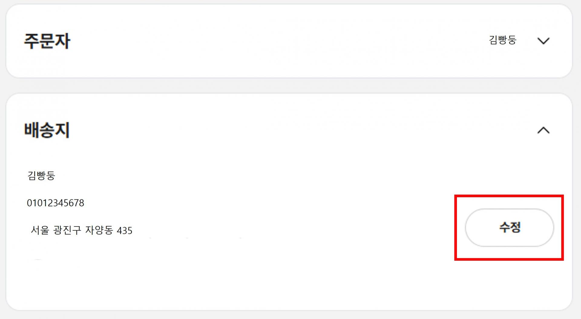 3) 주문 상세 내역 내 ‘ 배송지 정보’ 에서 ‘ 수정’ 버튼을 클릭해 주세요.